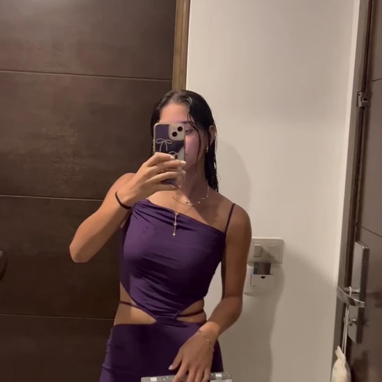 A sleek, deep purple gown with a twisted front cutout, ruched sides, and spaghetti straps. The dress features a backless design with a thin strap that ties at the lower back, connecting the front to the back for a seamless, fitted look. And the skirt includes adjustable drawstrings, giving it a customizable fit. Perfect for summer evening looks.