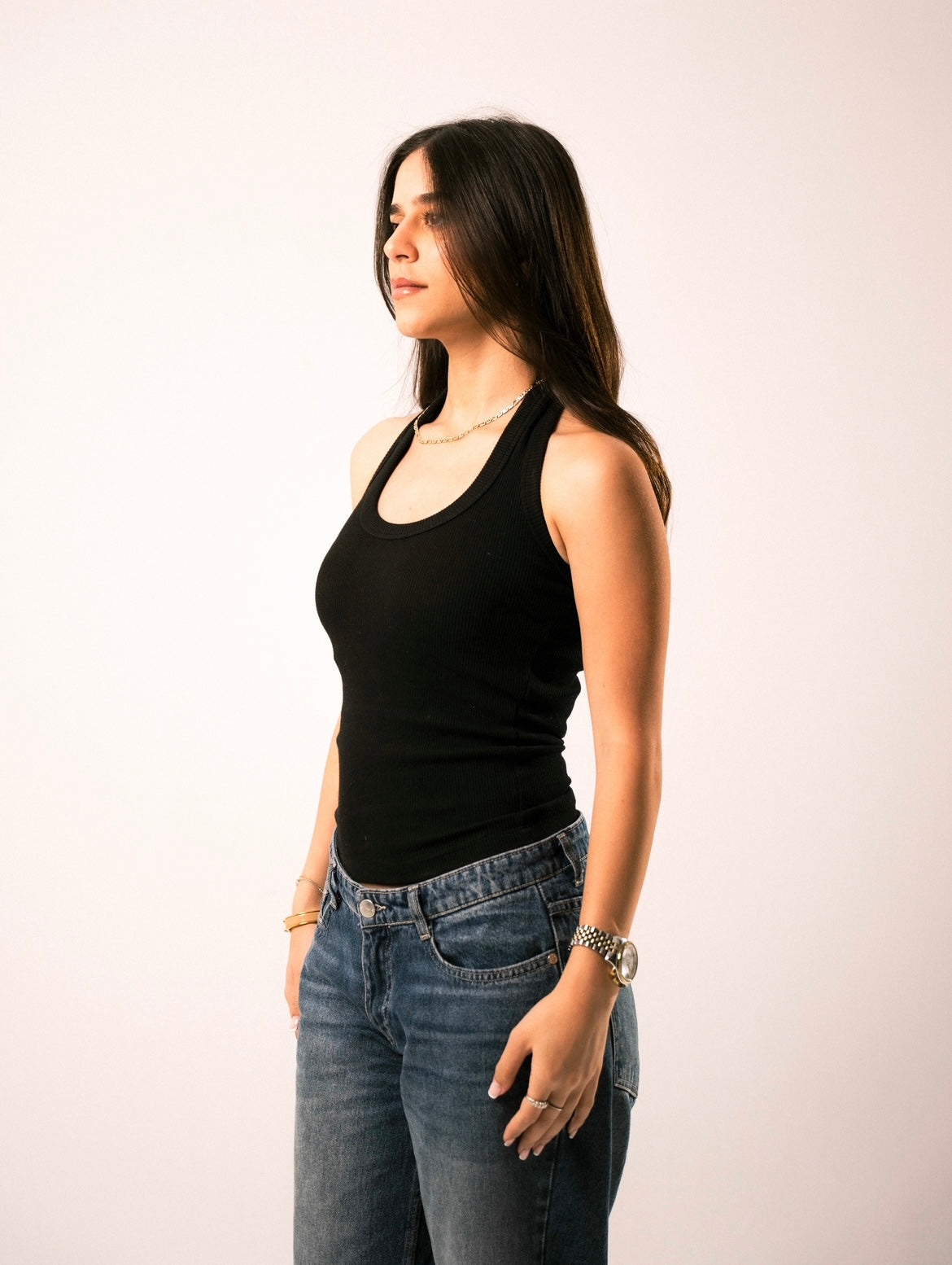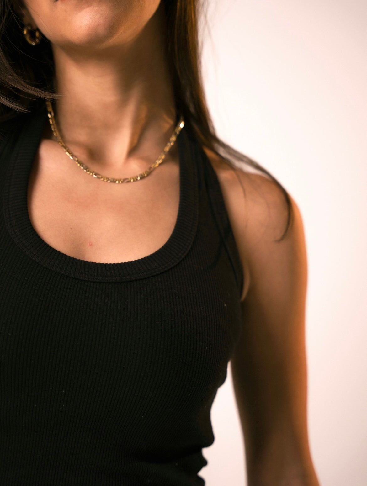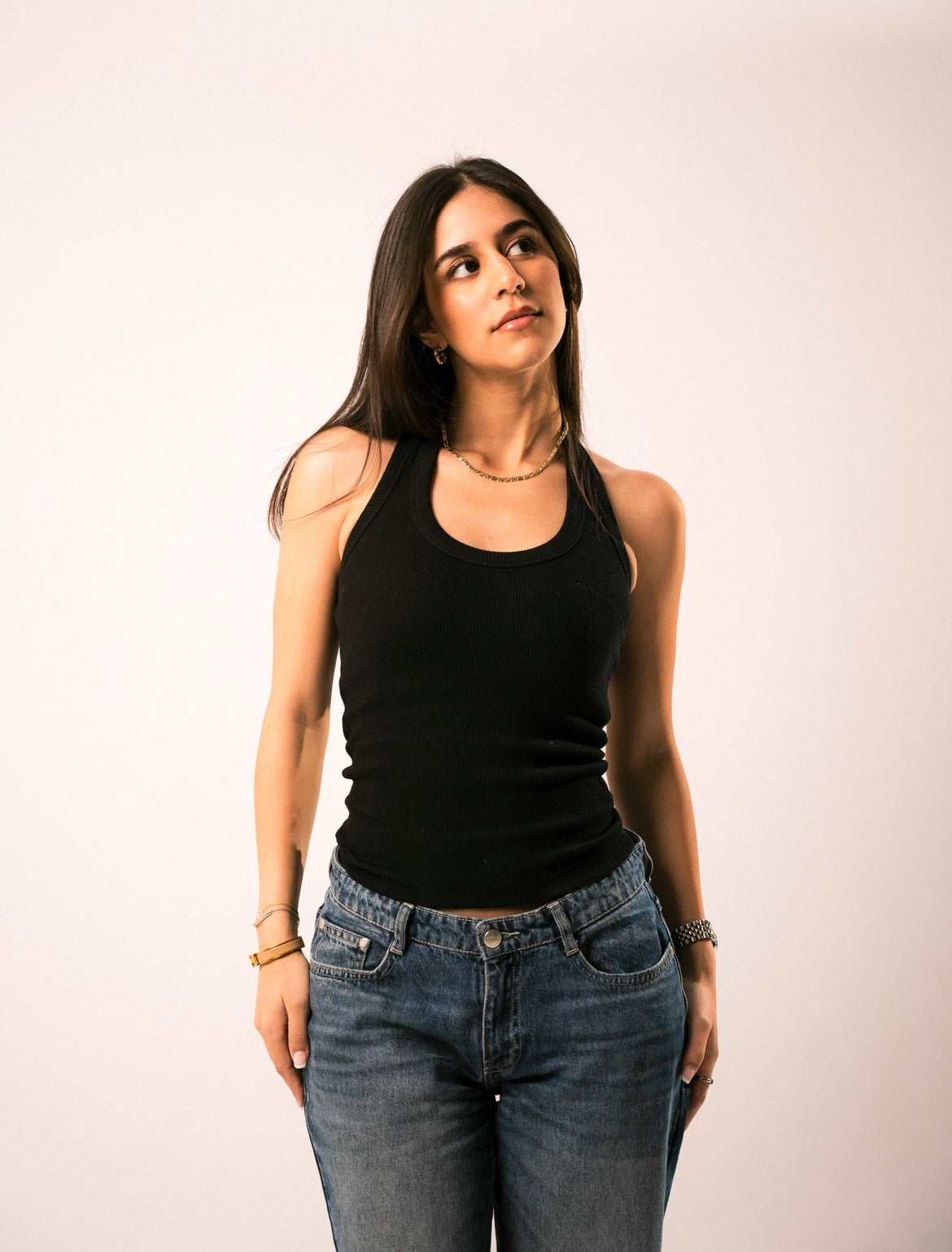 "Essential ribbed halter neck Lola top with an open back detail, made from 100% cotton, perfect for layering or standing out on its own "